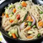 I keep a bag of roasted vermicelli on hand at all times. If you only have plain semiya, no big deal. You can quickly dry roast it in a pan until it turns lightly golden and smells toasty. That step alone makes a big difference in texture and keeps the noodles from clumping. A good tempering is your next best friend. Choose whole mustard seeds, urad dal, and chana dal for that classic nutty crunch. Add onions for sweetness and tomatoes if you like a bit of tang. For me, a handful of peas makes it extra cheery.